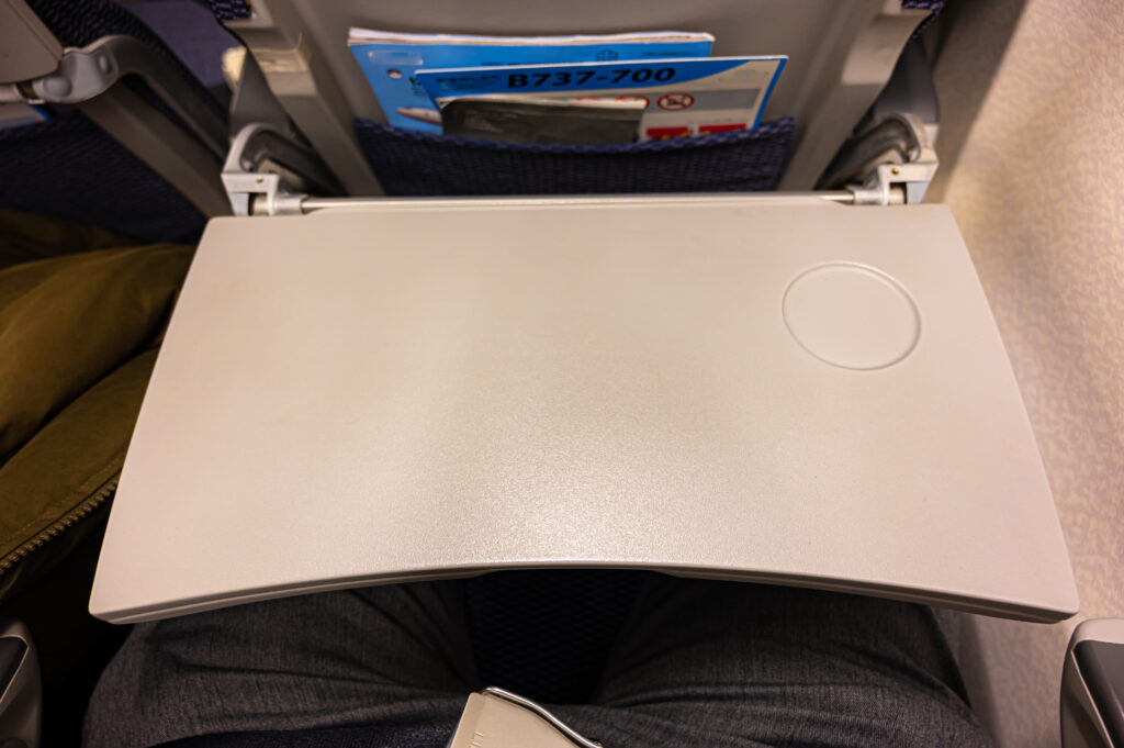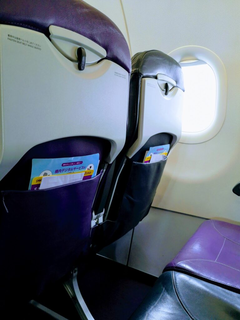 尚、座席上の収納棚には基本的に収納が出来ないので、そうなると、基本的にはフライト中は常に目に見える場所(テーブル等)に置いておくか、目の前にある網ポケットの中へ入れるなどしておく必要があると思われます。