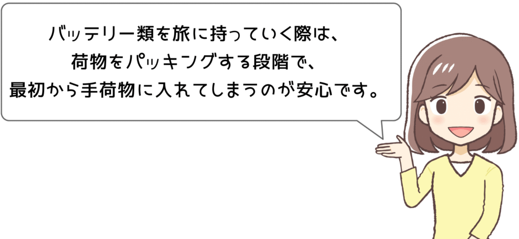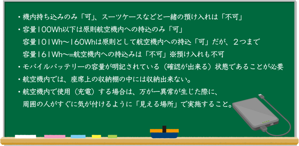まず、モバイルバッテリーは「機内持ち込み手荷物」としてのみが認められています。