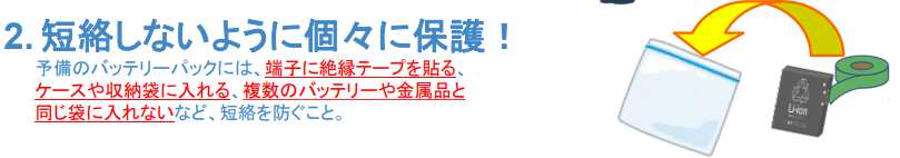 それらの収納がない場合は、モバイルバッテリーの端子部分をテープなどで隠すことで絶縁する(他の金属類などと接触しないようにする)等が必要となります。