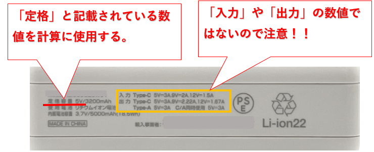 ここで使う「電圧(V)」とは、モバイルバッテリーに記載されている「定格電圧」という数値を見てください。