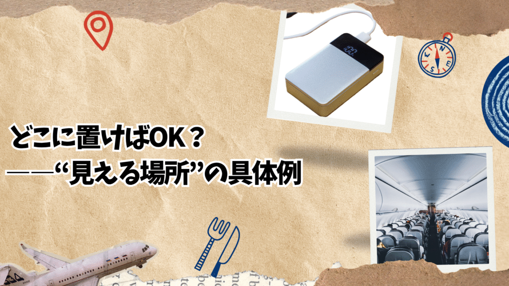 「座席上の収納棚」への収納禁止は言葉の通りですが、充電する場合の「目に見える場所」というのは具体的にどこなのでしょうか。